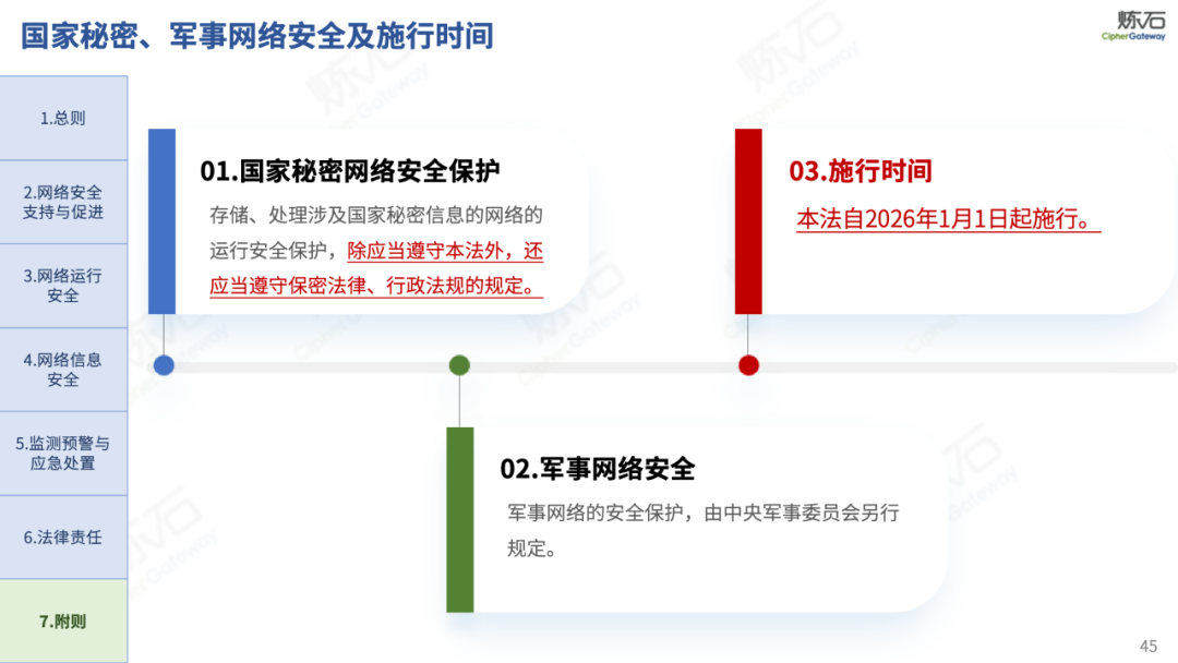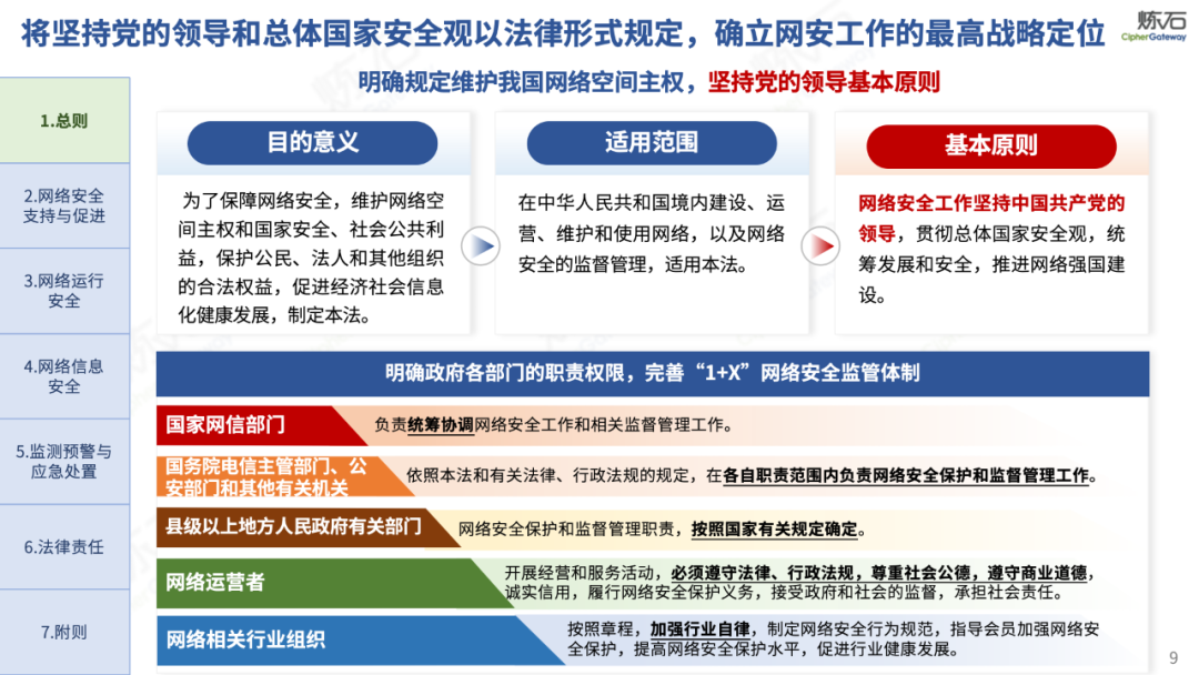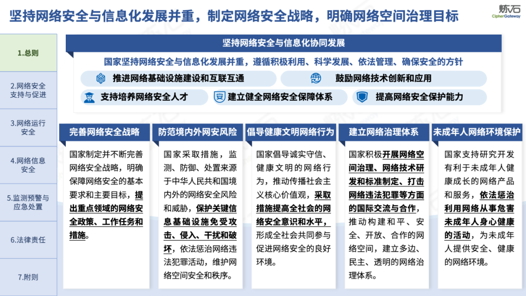 《网络安全法》共分为七章。第一章锚定网络安全与发展并重,明确立法目的、适用范围、根本原则和战略导向;第二章夯实网络安全技术与产业基础,从制度层面为产业发展提供支撑,关注新兴领域;第三章构建分级分类保护体系,以“网络运行安全”为核心构建双层架构;第四章守护数据安全与公民权益,平衡安全与发展、监管与权益的关系;第五章提升风险防控响应效能,构建监测预警与应急处置机制;第六章强化惩戒力度与法律衔接,大幅提升违法成本;第七章明确施行日期为2026年1月1日,为实施预留准备期。