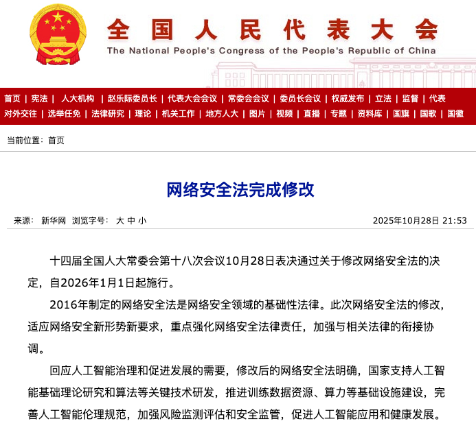 立足继往开来新起点,前瞻布局新兴领域安全。当前,我国正处于“十四五”规划收官、科学谋划“十五五”发展蓝图的关键时期。“十五五”规划建议要求,加强网络、数据、人工智能、生物、生态、核、太空、深海、极地、低空等新兴领域国家安全能力建设。与此同时,第十四届全国人大常委会第十八次会议于2025年10月28日通过《关于修改〈中华人民共和国网络安全法〉的决定》,新法将于2026年1月1日起正式施行。此次修法立足新时代网络安全形势,将党的领导、总体国家安全观等核心要义融入法律体系。