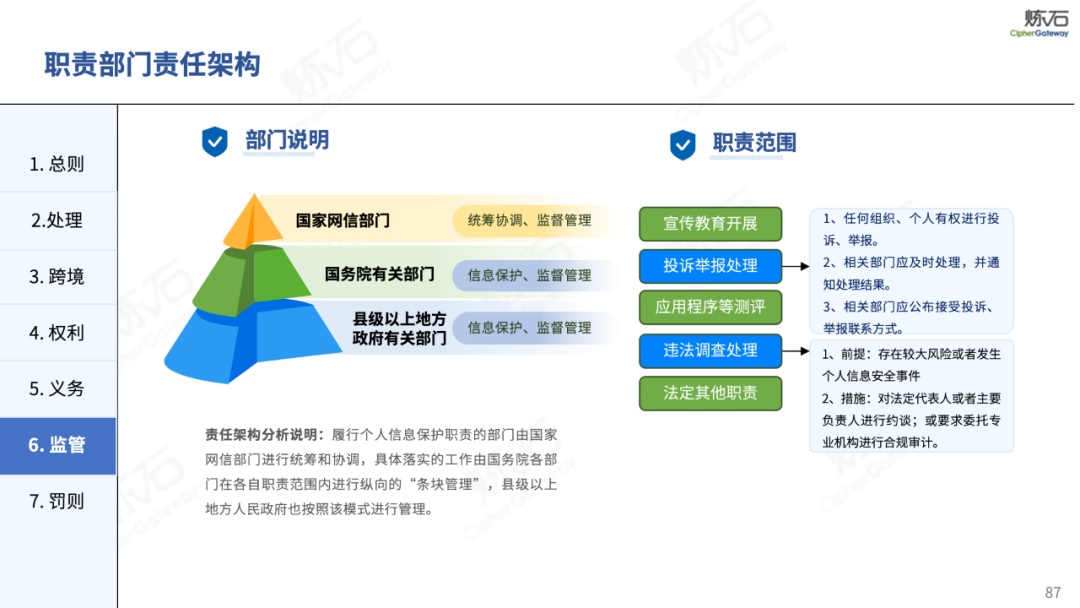 厘清主体责任边界强化监管协同,构建多方参与共建共治新格局。新法进一步厘清了网络运营者、数据处理者等各方主体的责任边界,强化了国家网信部门统筹协调、行业主管部门各负其责的监管机制,提升了跨部门、跨区域协同治理效能,为推动形成政府监管、企业履责、行业自律、社会监督的治理格局提供了更加有力的制度支撑。