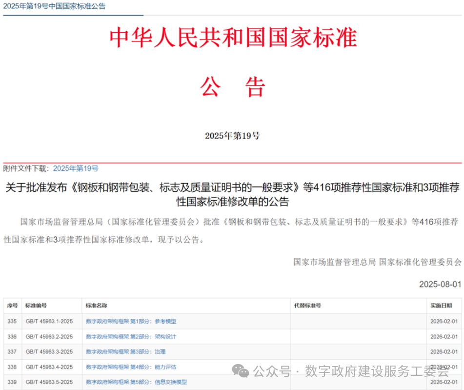 2025年8月1日,国家市场监督管理总局(国家标准化管理委员会)发布2025年第19号中国国家标准公告,批准GB/T 45963《数字政府架构框架》系列国家标准正式发布。在主管部门的指导下,该标准由全国信息技术标准化技术委员会(SAC/TC 28)归口管理,由中国电子技术标准化研究院联合相关政府单位、高校、研究机构、企业和服务机构等单位共同研制。该系列标准为开展数字政府顶层设计提供了概念级的方法,有助于数字政府规划方、设计方、开发方、建设方建立统一认识,对于提升数字政府规划的全局性、科学性和连续性具有重要意义。