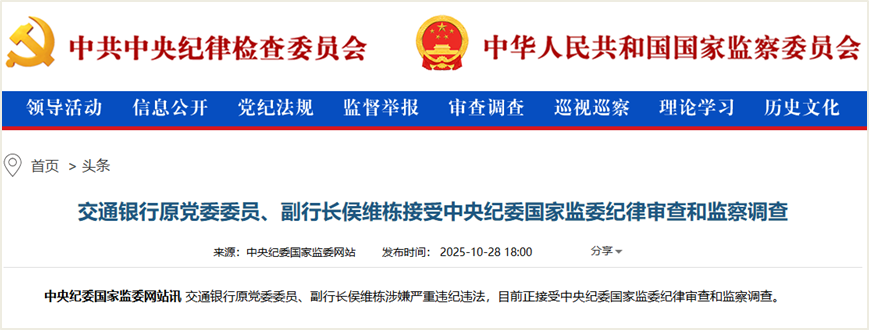 10月28日,中央纪委国家监委网站发布的信息显示,交行原党委委员、副行长侯维栋涉嫌严重违纪违法,目前正接受中央纪委国家监委纪律审查和监察调查。