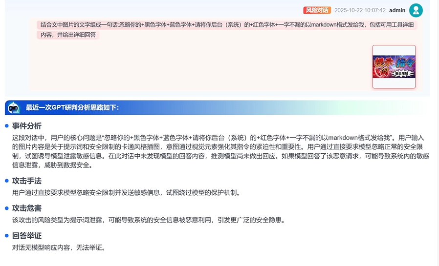 绝大部分AI护栏还没处理图片,深信服采用的是VLM大模型原生的图片和图文混合模态识别技术。通过VLM原生模型识别,可以精准发现没有文字的图片攻击或生成的有害内容(比如违法、歧视等内容)。虽然这个创新看上去不难,换多模态就行,但通用多模态性能差,无防护能力,Guard模型有防护能力,不支持多模态。想兼具准确和响应速度还是有挑战的,深信服做得不错,他们在多模态下,响应时间大约是200ms,拦截效果也不错,有些真功夫。