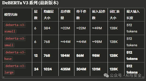 由于AI护栏对性能和响应时间要求高,最初很多方案采用的是BERT模型,这是因为BERT模型具备分类能力,且模型够小,对资源占用少,响应快。以下是一些主流模型的尺寸