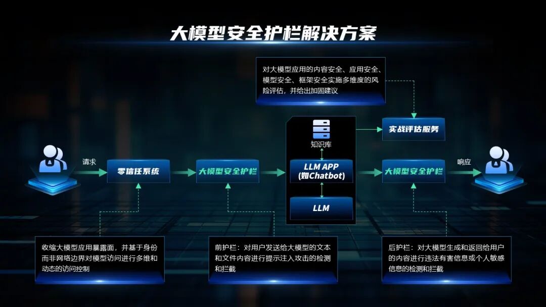 深信服在护栏方案里也加入相关能力,以零信任网关的形式整合系统,收缩应用暴露面,做完整的防护。这块本来就是传统能力的结合,对安全厂商来说,都不难,迟早都得上。除了传统的漏洞防护,与现有的身份管理,权限管理整合也是必须要做的,AI应用一旦被正式接受,进入实际工作,传统的所有的安全管理需求都要加进来。