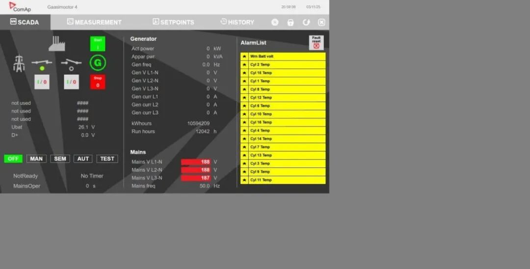 表象:发电机显示OFF/NotReady,发电侧功率、电流、频率归零;市电侧三相电压降至约187–188 V(明显欠压);报警项出现蓄电池电压警告与多处气缸温度报警。