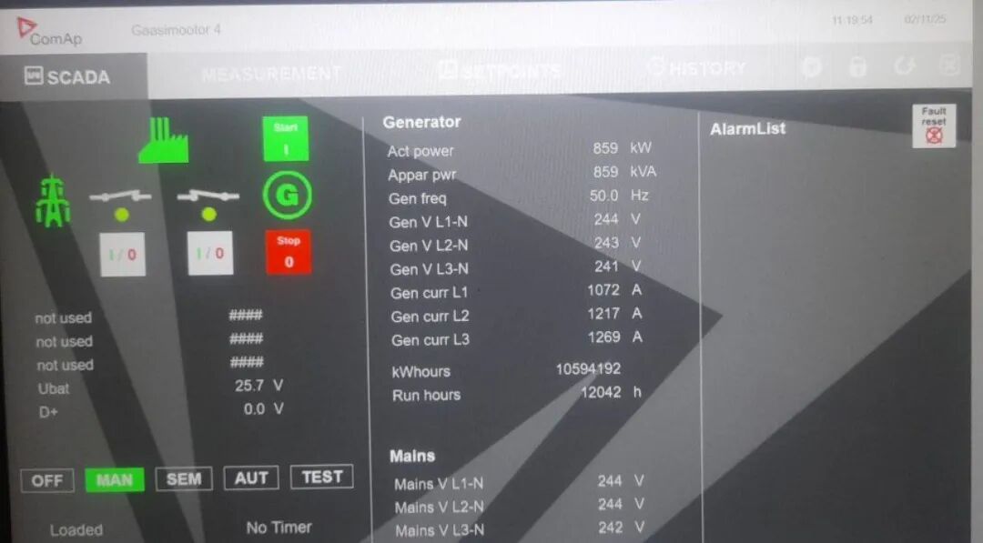 表象:发电机显示为手动(MAN)并带载运行;功率、三相电压(约241–244 V)与频率(50 Hz)均处于正常范围;无报警提示,蓄电池电压显示正常(25.7 V)。