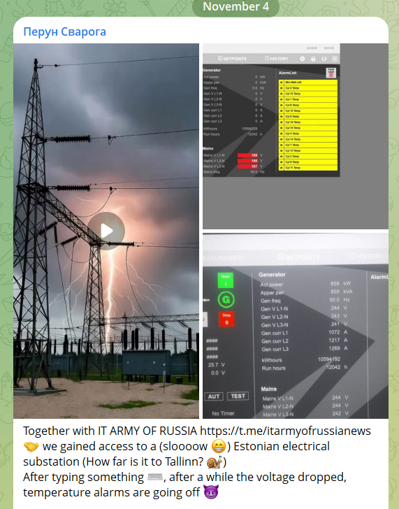 【2025年11月4日监测发现】名为Perun Svaroga 的俄语黑客组织在其 Telegram频道上声称,与“俄罗斯IT军队”(IT Army of Russia)联合,对爱沙尼亚境内一处电力变电站控制系统实施了远程入侵。该组织发布了疑似来自电力监控界面(HMI)的截图和视频,声称攻击导致电压骤降及温度报警。视频片段显示高压线路闪光火花,而界面数据显示发电机状态异常,引发外界对其真实性及爱沙尼亚电网安全状况的关注。目前,爱沙尼亚官方尚未就此事件发布确认声明,安全专家则提醒该事件“具有一定的技术可行性”,但仍需进一步取证。