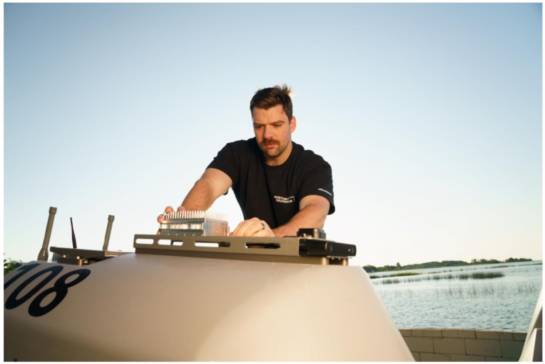 乔治亚州沃纳罗宾斯市的电气工程师康纳・伍德(Connor Wood)正将诺斯罗普・格鲁曼公司的 “战术前沿电磁解决方案”(TEEMS)战术前沿设备集成到无人水面舰艇上,为 “沉默蜂群2025” 电子战演示做准备。