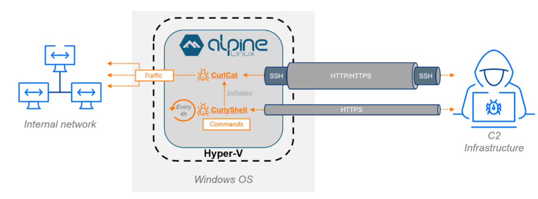 攻击者在受感染的Windows机器上启用了Hyper-V功能,然后下载并导入了一个基于Alpine Linux的轻量级虚拟机,该虚拟机中包含了他们的恶意软件,从而能够持续且隐蔽地访问本地网络。