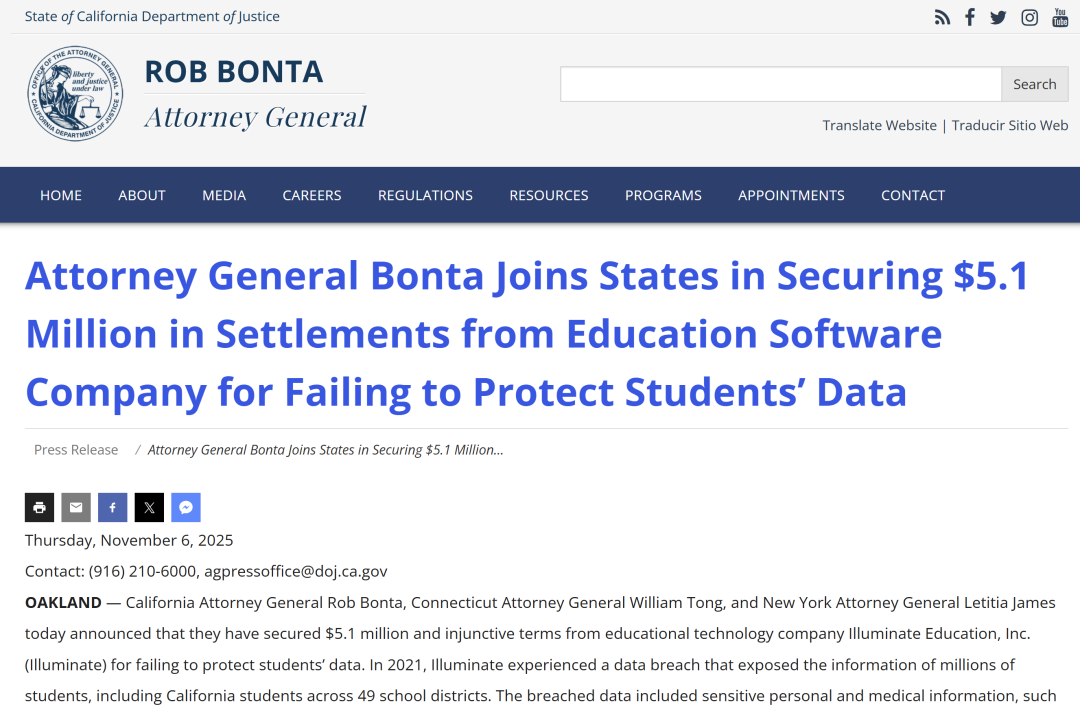 2025年11月6日,美国加州、纽约州与康涅狄格州三位总检察长联合宣布,教育科技公司Illuminate Education, Inc.(以下简称“Illuminate”)因未能采取基本数据安全措施,导致2021年发生大规模学生数据泄露事件,将支付总计510万美元的民事罚款,并接受一系列强制性安全整改要求。其中,仅加州一地就获得325万美元赔偿,涉及超过43.4万名本地学生的敏感信息被盗。此案不仅成为加州《K-12学生在线个人信息保护法》(KOPIPA)实施以来的首例执法行动,更向整个教育科技行业敲响警钟:保护儿童数据不是可选项,而是法律底线。