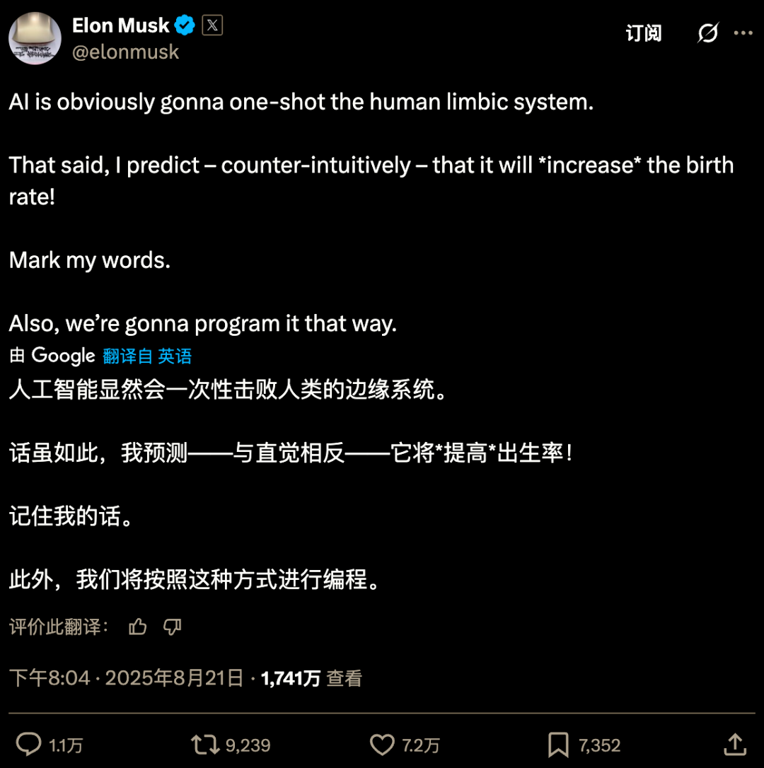 在马斯克看来,像Ani这样的AI伴侣可以成为人们情感寄托的替代,甚至可能激发现实中的亲密关系,从而缓解低迷的人口出生率。