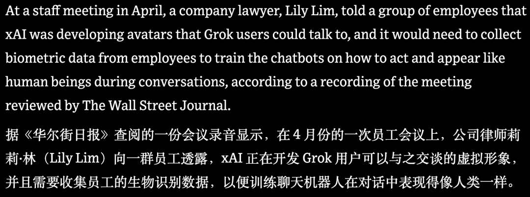 据《华尔街日报》调查,今年4月xAI在一次全员会议上要求多名员工提交自己的面部录像和语音录制,用于训练包括Ani在内的新一代聊天机器人。