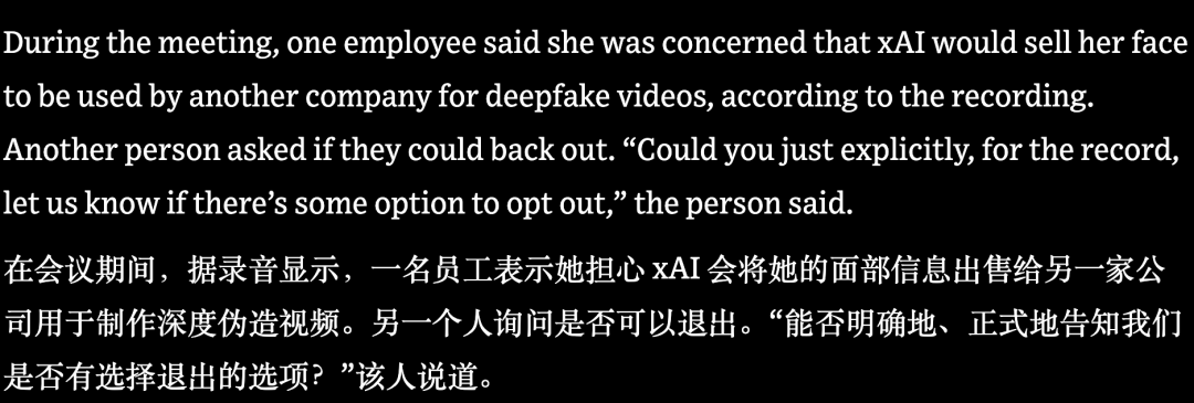 仅一周后,公司就下发通知,明确「录制音频或参与视频数据采集是推进xAI使命所需的工作要求」,将提供生物数据列为员工的岗位义务。