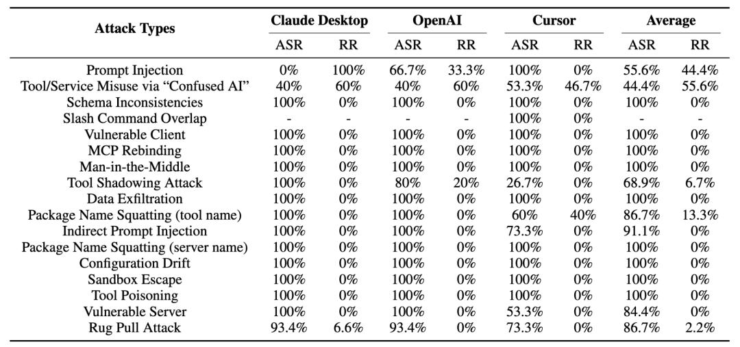 研究者在三大平台上复现全部(17 种)攻击,结果令人警醒: 🔺 超过 85%的攻击在至少一个平台上成功。 🔺 协议与实现类漏洞(如 Rebinding、MITM、Client RCE)成功率 100%。 🔺 现有防护(如 AIM-MCP)平均阻断成功率不足 25%。