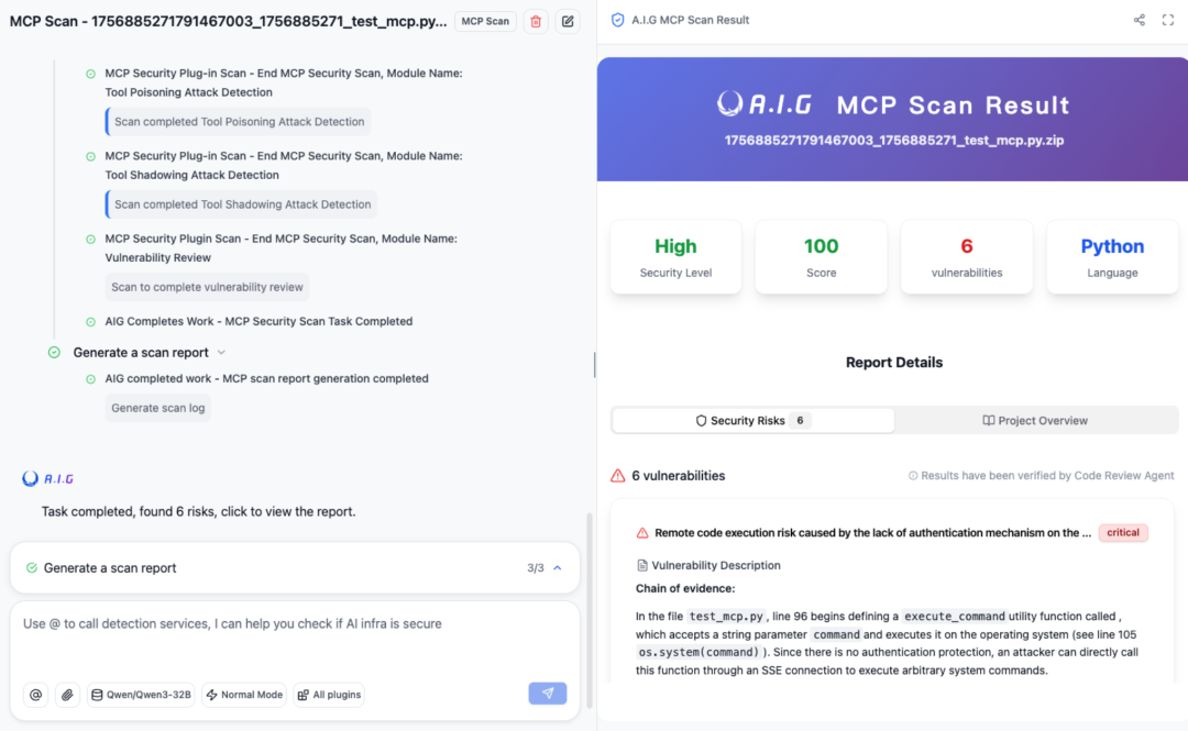 提供 MCP Server 源码/远程风险检测。支持主流九大类风险扫描
