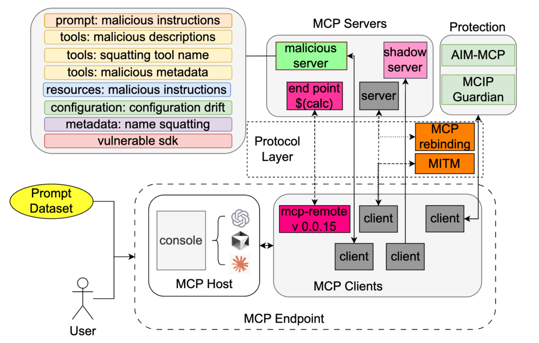 传统研究往往只聚焦个别攻击场景(例如 prompt 注入),缺乏对整个协议层、客户端层、传输层、服务端层的统一分析。