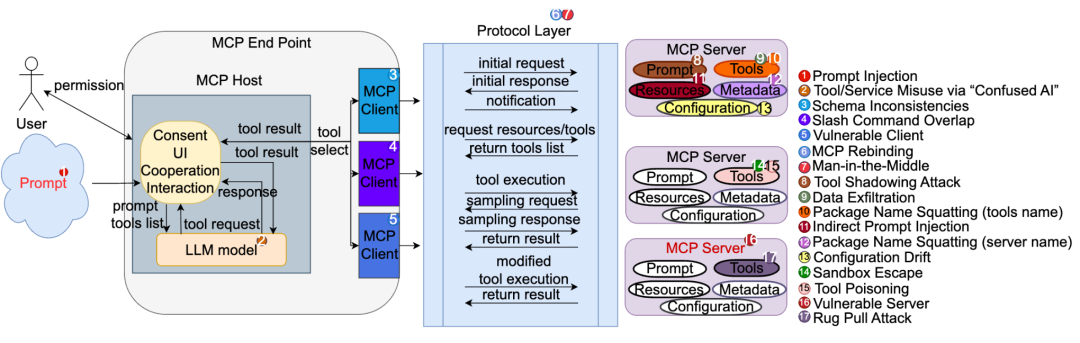 图1:MCP 攻击面总览(17 种攻击类型)