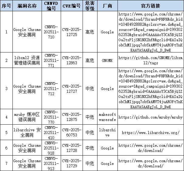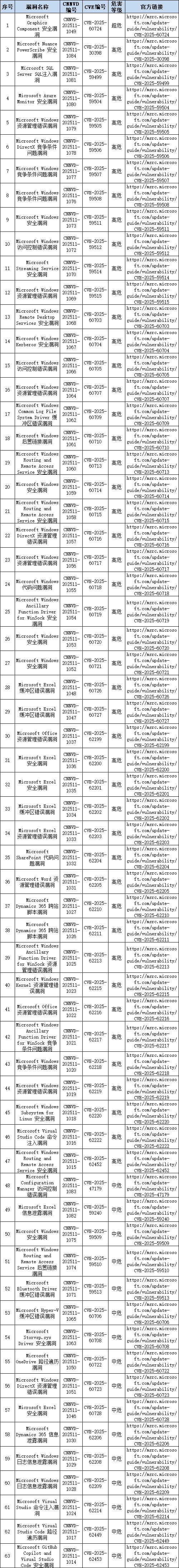 2025年11月11日,微软发布了2025年11月份安全更新,共70个漏洞的补丁程序,CNNVD对这些漏洞进行了收录。本次更新主要涵盖了Microsoft Windows 和 Windows 组件、Microsoft Windows Subsystem for Linux、Microsoft Dynamics 365、Microsoft Nuance PowerScribe、Microsoft Graphics Component、Microsoft Visual Studio等。CNNVD对其危害等级进行了评价,其中超危漏洞1个,高危漏洞48个,中危漏洞21个。