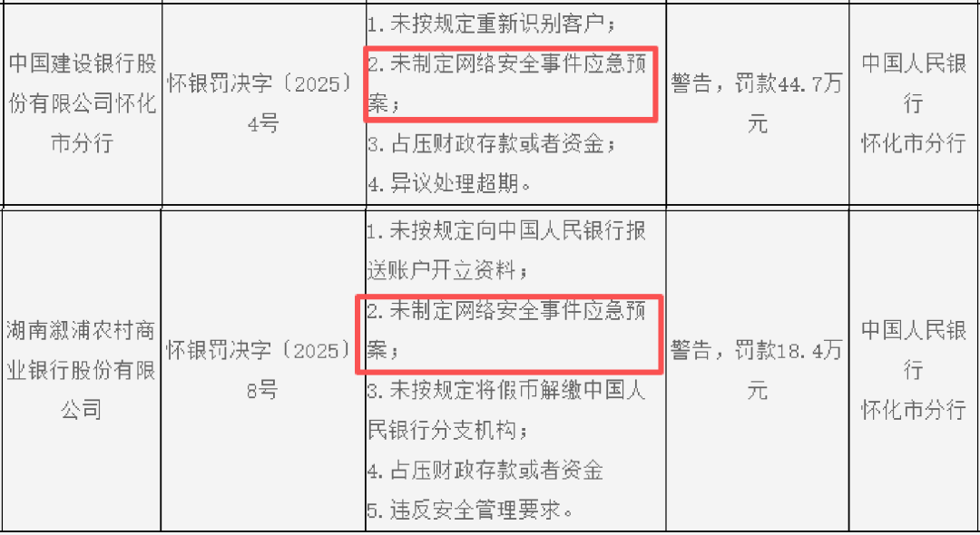 9月15日,中国人民银行怀化市分行发布的行政处罚信息显示:建设银行怀化市分行因“未制定网络安全事件应急预案”等4项违法行为,被警告,并被罚款44.7万元;湖南溆浦农商银行因“未制定网络安全事件应急预案;违反安全管理要求”等5项违法行为,被警告,并被罚款18.4万元。
