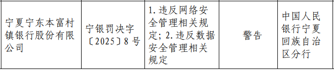 10月16日,中国人民银行宁夏回族自治区分行发布的行政处罚信息显示,宁夏宁东本富村镇银行因“违反网络安全管理相关规定;违反数据安全管理相关规定”,被警告。企查查信息显示,该行的最大股东为龙江银行,后者持股比例为81.63%。