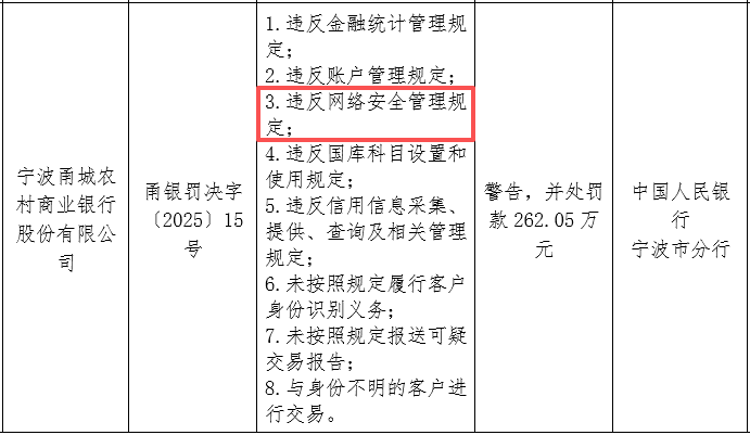 9月11日,中国人民银行宁波市分行发布的行政处罚信息显示,宁波甬城农商银行因“违反网络安全管理规定;违反信用信息采集、提供、查询及相关管理规定”等8项违法行为,被警告,并被罚款262.05万元。