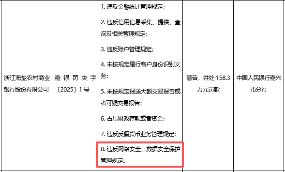 9月18日,中国人民银行嘉兴市分行发布的行政处罚信息显示,浙江海盐农商银行因“违反信用信息采集、提供、查询及相关管理规定;违反网络安全、数据安全保护管理规定”等8项违法行为,被警告,并被罚款158.3万元。