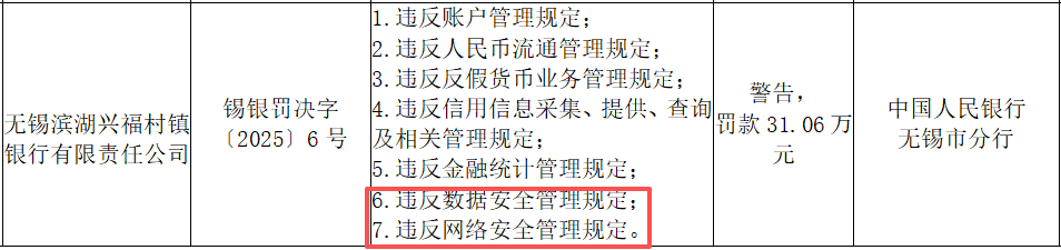 10月11日,中国人民银行无锡市分行发布的行政处罚信息显示,无锡滨湖兴福村镇银行因“违反信用信息采集、提供、查询及相关管理规定;违反数据安全管理规定;违反网络安全管理规定”等7项违法行为,被警告,并被罚款31.06万元。企查查信息显示,该行的最大股东为兴福村镇银行,而兴福村镇银行为最大股东为江苏常熟农商银行。