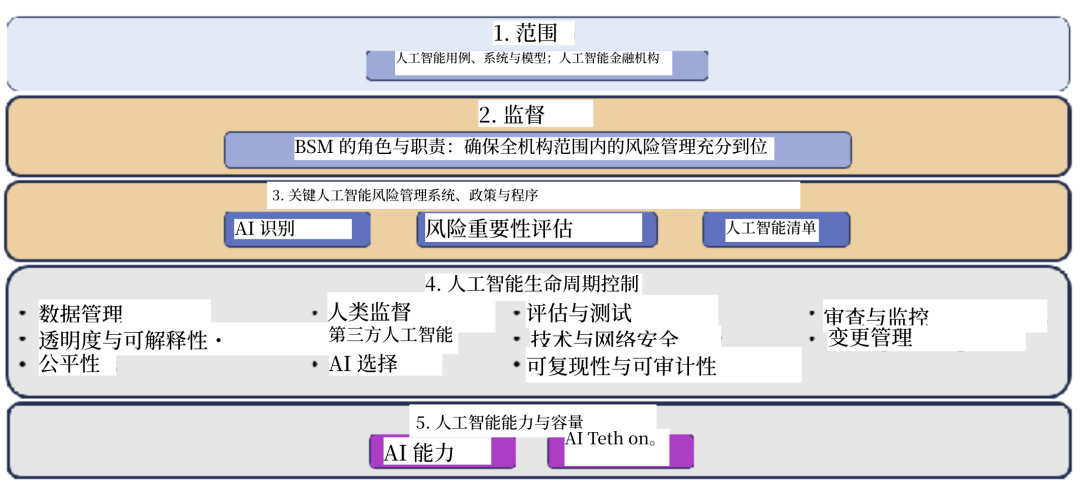 该指引阐述了新加坡金融管理局(MAS)对金融机构(FIs)董事会和高级管理层在多个领域内治理和监督人工智能相关风险的期望。这些期望包括金融机构需建立并有效实施相关框架、结构、政策及流程,以识别和盘点人工智能的使用情况、评估其风险重要性、制定必要的治理和风险管理框架、政策及流程,以及在人工智能的整个生命周期内对其风险进行管理。董事会和高级管理层还应培育适用于人工智能使用的风险文化,并确保更新现有的全机构风险管理体系,以应对人工智能使用所带来的风险。若某家金融机构的整体人工智能风险敞口被认定为具有重要性15,新加坡金融管理局(MAS)建议该机构设立专门的跨职能委员会,以确保实施充分的监督,并主动解决风险管理中可能存在的漏洞。