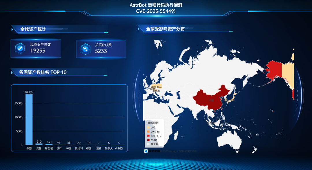 AstrBot 远程代码执行漏洞(CVE-2025-55449)关联的全球风险资产总数为19235个,关联IP总数为5233个。全球风险资产分布情况如下: