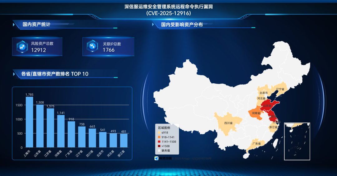 奇安信鹰图资产测绘平台数据显示,深信服运维安全管理系统远程命令执行漏洞(CVE-2025-12916)关联的国内风险资产总数为12912个,关联IP总数为1766个。国内风险资产分布情况如下: