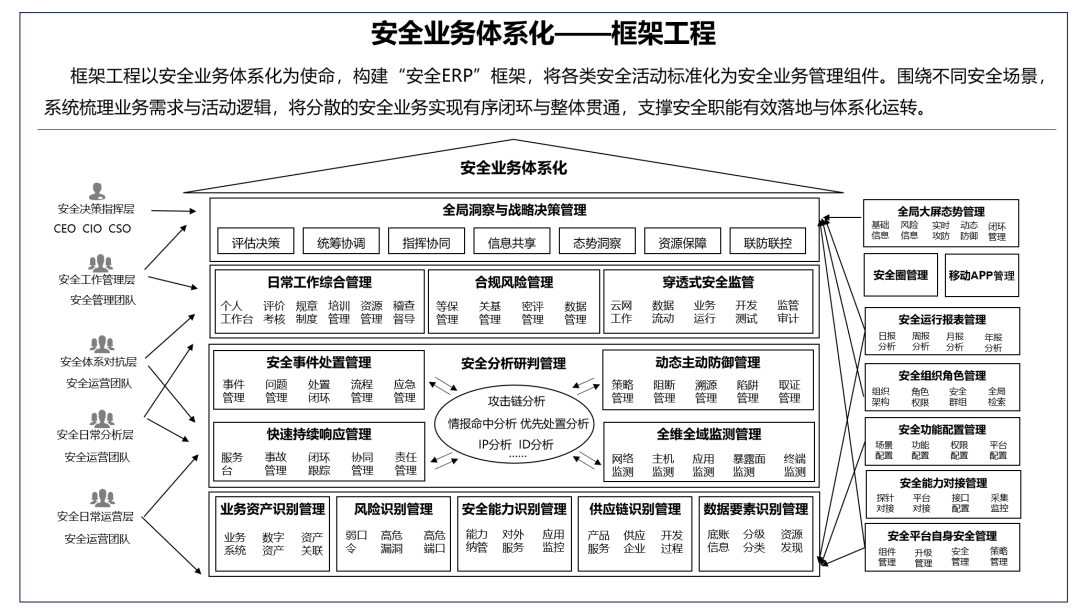 数字化安全ERP的核心内涵在于将所有安全活动——包括数字化业务与资产管理、安全风险管理、安全能力管理、全维全域监测管理、精准分析研判管理、快速响应管理、主动防御管理等,标准化为安全业务管理组件,并最终服务于数字化组织的整体战略目标。为实现这一目标,需围绕决策指挥、安全管理、安全技术与运营等不同安全职能及实际场景,提炼核心安全业务需求,并系统性地梳理各项安全业务活动及其逻辑关系,将传统分散的、独立的安全业务实现有序闭环,从而支撑安全战略、管理、技术、运营等各层级安全工作,最终实现安全业务体系的整体贯通与持续赋能。