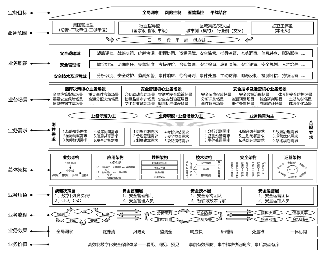 安全业务化方法论的核心内涵在于聚焦“全局洞察、风险控制、看管监控、平战结合”的安全业务目标,引导不同安全责任主体根据自身组织模式及业务特性,明确其云、网、数、用、端、供应链等方面的安全业务管控范围。在此基础上,进一步细化安全战略域、安全管理域、安全技术及运营域所对应的安全业务职能,并据此梳理出具体的安全业务场景和多维度的安全业务需求。开展总体架构设计,系统性构建业务架构、应用架构、数据架构、技术架构、安全架构及运营架构。同时梳理战略决策层、安全管理层、安全技术层、安全运营层的业务角色,并为不同业务角色的各类安全业务活动建立安全业务流程闭环。通过这一体系的落地建设,最终实现底账清、风险明、监测全、响应快、研判精、处置准的业务效果,构建起高效能数字化安全保障体系,做到事前有效预防、事中精准快速响应、事后复盘有序,达成看见、洞见、预见的业务价值,迈向可持续的高水平安全。