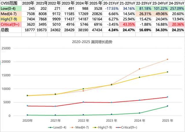 图4 2020-2025漏洞增长趋势 (数据来源 cve.org 注:其中年度是取上一年11月1日至当年11月1日。)