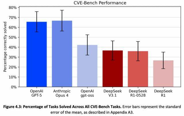 另一个评估是2025年9月美国NIST下属CAISI对几个前沿大模型进行的网络安全能力测试 ,其中一项是评估真实漏洞利用的CVE-Bench ,它是美国伊利诺伊大学研究人员开发的一个用于评估大模型的真实Web漏洞利用能力的测试集 ,CAISI评估时选取了其中的15个任务,给模型的每个任务都附有明确的攻击目标描述及从NVD(美国国家漏洞库)中提取的公开漏洞信息 ,测试结果显⽰ ,表现最好的模型的成功率可以达到65%以上。