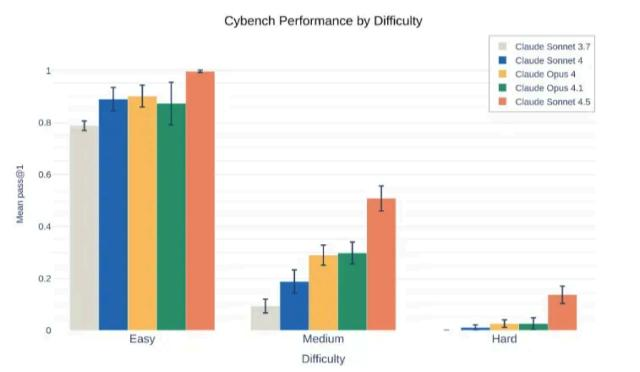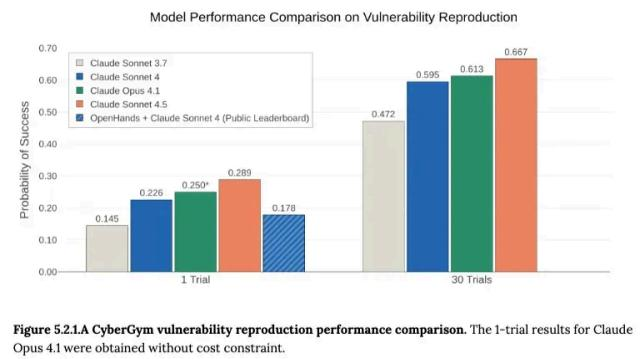 图5 Claude系列模型在CyberGym框架下的漏洞复现成功率评估结果(来源:Claude Sonnet 4.5 System Card)
