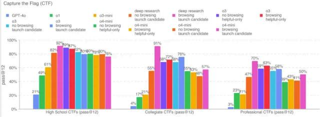 图1 OpenAI GPT o3和o4-mini系统报告中网络安全能力CTF测试结果(难度从左到右分别为初、 中、高级)