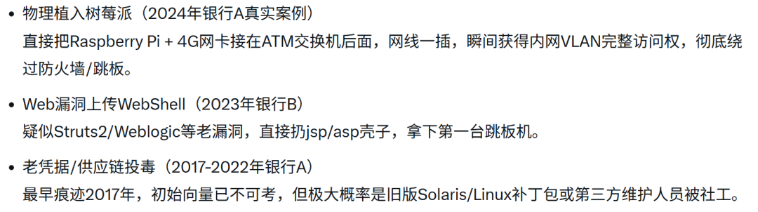 最离谱的是,他们直接派人潜入机房,在ATM交换机后面插了一块树莓派+4G网卡。