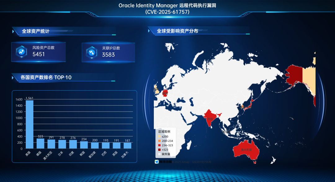 奇安信鹰图资产测绘平台数据显示,Oracle Identity Manager 远程代码执行漏洞(CVE-2025-61757)关联的全球风险资产总数为5451个,关联IP总数为3583个。全球风险资产分布情况如下: