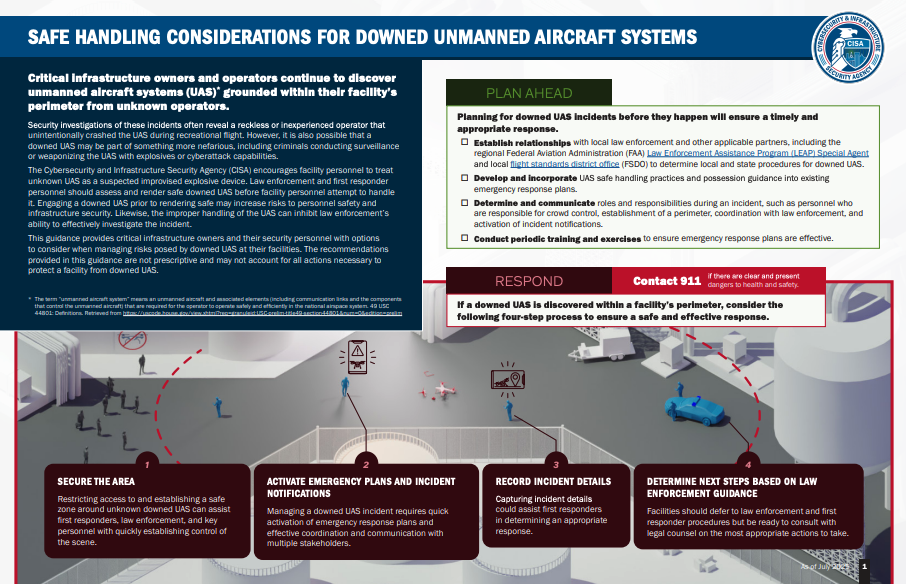 CISA采取相对保守的默认假设:未知来源的坠落无人机应被视为潜在爆炸物或网络威胁,直至确认安全。指南强调以下要点: