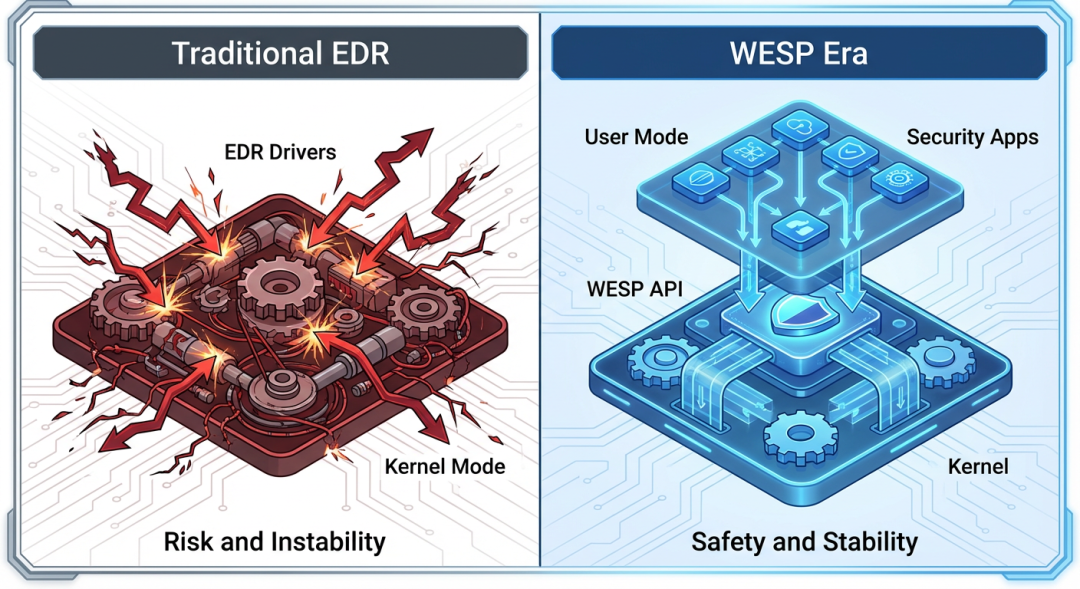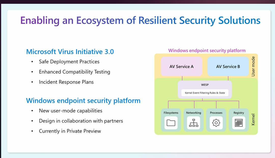 该事件发生后,微软在 Ignite 2024 上正式宣布了 Windows 弹性计划 — 为避免此类事件在未来再次发生而重新设计终端安全软件与内核交互方式的计划。在 25 年 6 月份的博客中,微软就已透露其愿景:通过与安全厂商合作,推动反病毒和终端保护程序“降级”,像普通应用程序一样在用户模式下运行。直到上周五 WESP 正式公布,标志着 Windows 端点安全防护模式面临全新的变革,也对安全厂商提出了新的技术挑战。
