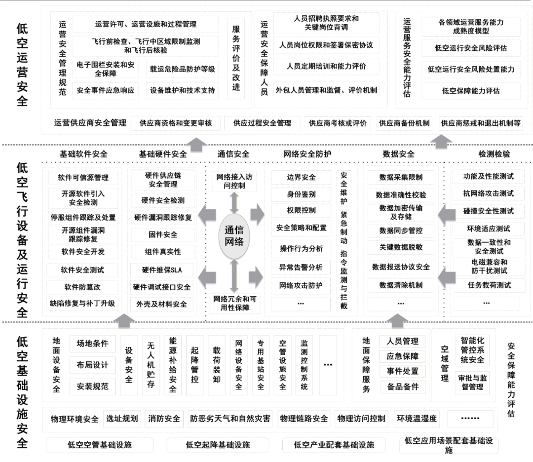 低空经济呈现出巨大的生态效应,其生态链条可划分为上游、中游、下游,共同构成一个相互依存、协同发展的完整生态系统。上游为核心技术与零部件供应商,中游为飞行器制造主体,下游聚焦于运营服务与基础设施保障。随着国家逐步重视低空经济发展,逐步将低空经济作为国家战略性信息产业,市场对低空领域相关产品的质量、安全和性能等方面提出更高要求,本文主要从法规政策、标准体系等视角,讨论低空经济发展中安全防护体系的构建。
