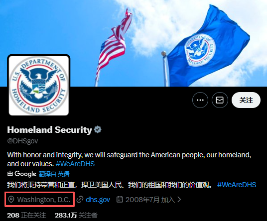 在舆论高压下,X 暂时关闭了该功能。直到当地时间11月23日,功能再次上线。重新开放后:DHS 账户显示地址为“华盛顿”,但外媒注意到:DHS 是唯一一个显示所在地的美国灰标政府账户。其他美国政府账号则只显示创建日期和验证日期,不再显示位置。这一反常情况让许多观察者更加困惑:是技术问题导致“特殊处理”?还是 X 主动对政府账户采取了不同策略?