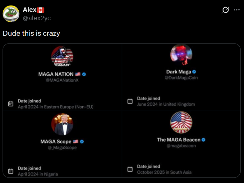 社交媒体瞬间被大量病毒式传播的截图与录屏淹没——许多自称“爱国美国人”的高互动 MAGA(Make America Great Again)账号,被显示为来自东欧、泰国、尼日利亚甚至孟加拉国。