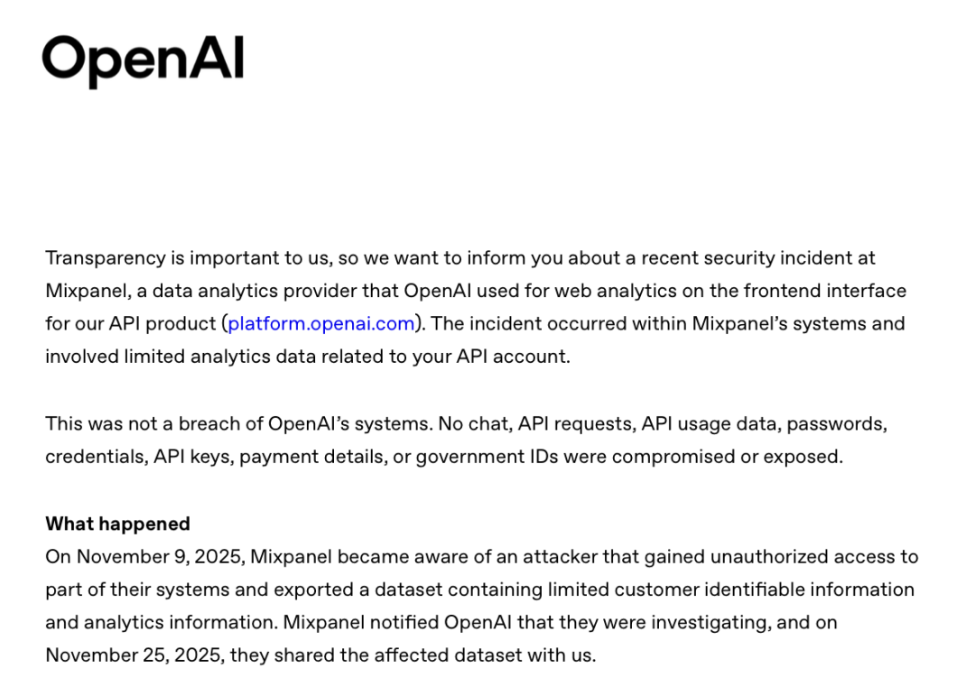 OpenAI于11月25日收到Mixpanel在持续调查后提供的受影响数据集详情。