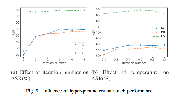 迭代次数:大部分文本优化在 N=1(第一轮迭代)时就取得了最大幅度的 ASR 提升,后续迭代主要是微调。