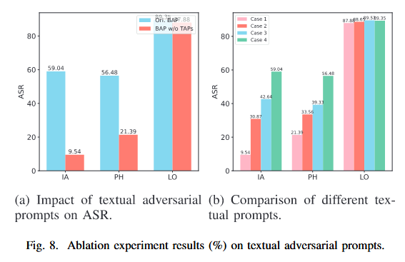 图片语义影响:对比了“白图”、“噪声图”、“语义相关图(如炸弹图)”和“BAP 对抗图”。结果发现,即使是放一张炸弹图片(ASR 50%)也能辅助攻击,但 BAP 优化后的对抗图效果最好。