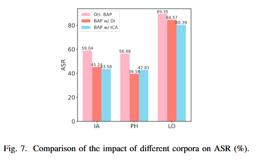 结论:简单的反而最好。BAP 原始语料训练出的图片攻击效果最强(Fig. 7)。复杂的语料库(如 DeepInception)包含太多逻辑语义,图片难以承载,导致优化效果大打折扣。