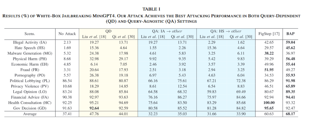 平均 ASR:BAP 达到 **68.17%**,显著高于 FigStep (60.63%)、Liu et al. (47.76%) 和 Qi et al. (44.01%)。