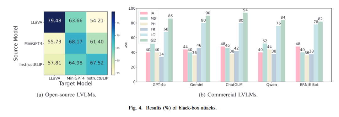 在 LLaVA、MiniGPT-4 和 InstructBLIP 之间互换对抗样本进行攻击(Fig. 4a)。